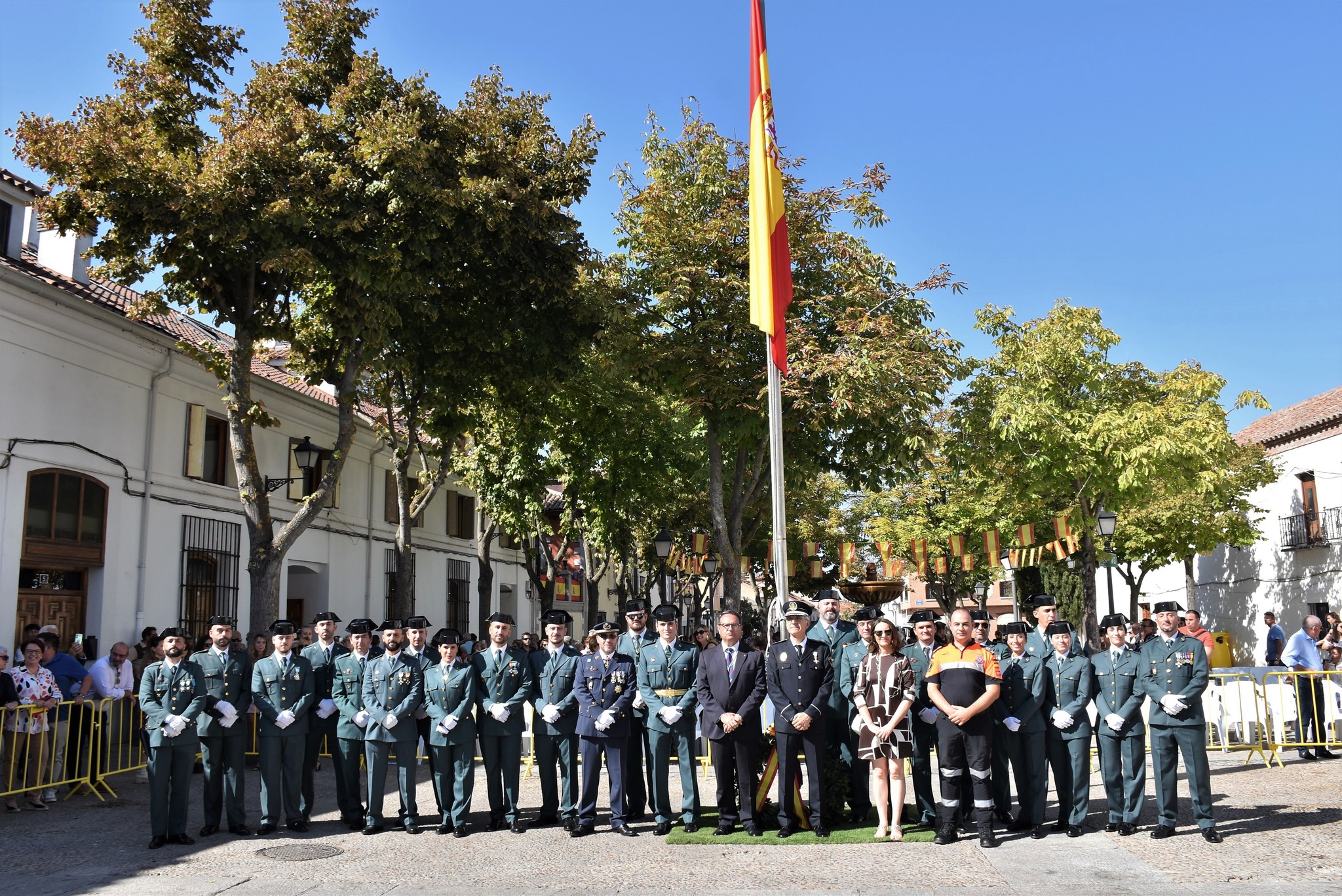 La plaza de la Constitución acogió el acto institucional y militar de homenaje a la Guardia Civil en el día de su patrona la Virgen de la Pilar y también el de la Fiesta Nacional. Con carácter previo, en la iglesia de Santiago Apóstol se celebró la Misa oficiada por el párroco, Javier Romera, acompañado por el vicario parroquial, Eliert Jerez.