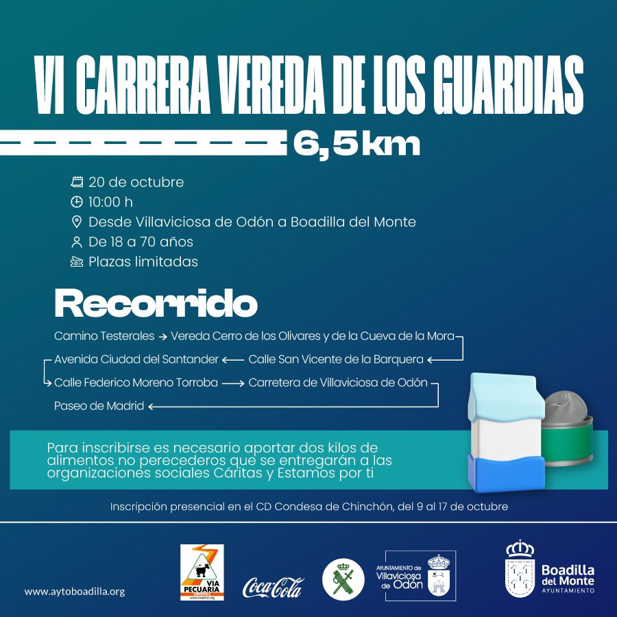 El Ayuntamiento de Villaviciosa de Odón colabora en la celebración de la Carrera Vereda de los Guardias, organizada por el Ayuntamiento de Boadilla del Monte y la Guardia Civil. Esta prueba, que cumple su sexta edición, realiza el recorrido que antaño hacían a pie los guardias desde el cuartel de Villaviciosa de Odón a Boadilla del Monte.