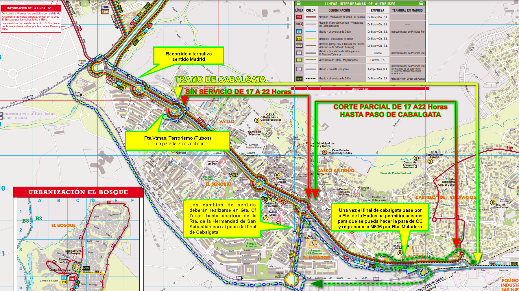 En sentido bajada, desde Avenida Villaviciosa a Avenida Príncipe de Asturias, de 17:00 a 18:30 no podrá acceder. 18.30 es la hora prevista por la que el final de cabalgata pasará por la Fuente de la Hadas y podrá hacer cambio de sentido para acceder a la M-506 por la Rotonda de Matadero y seguir el mismo itinerario que las otras líneas.
