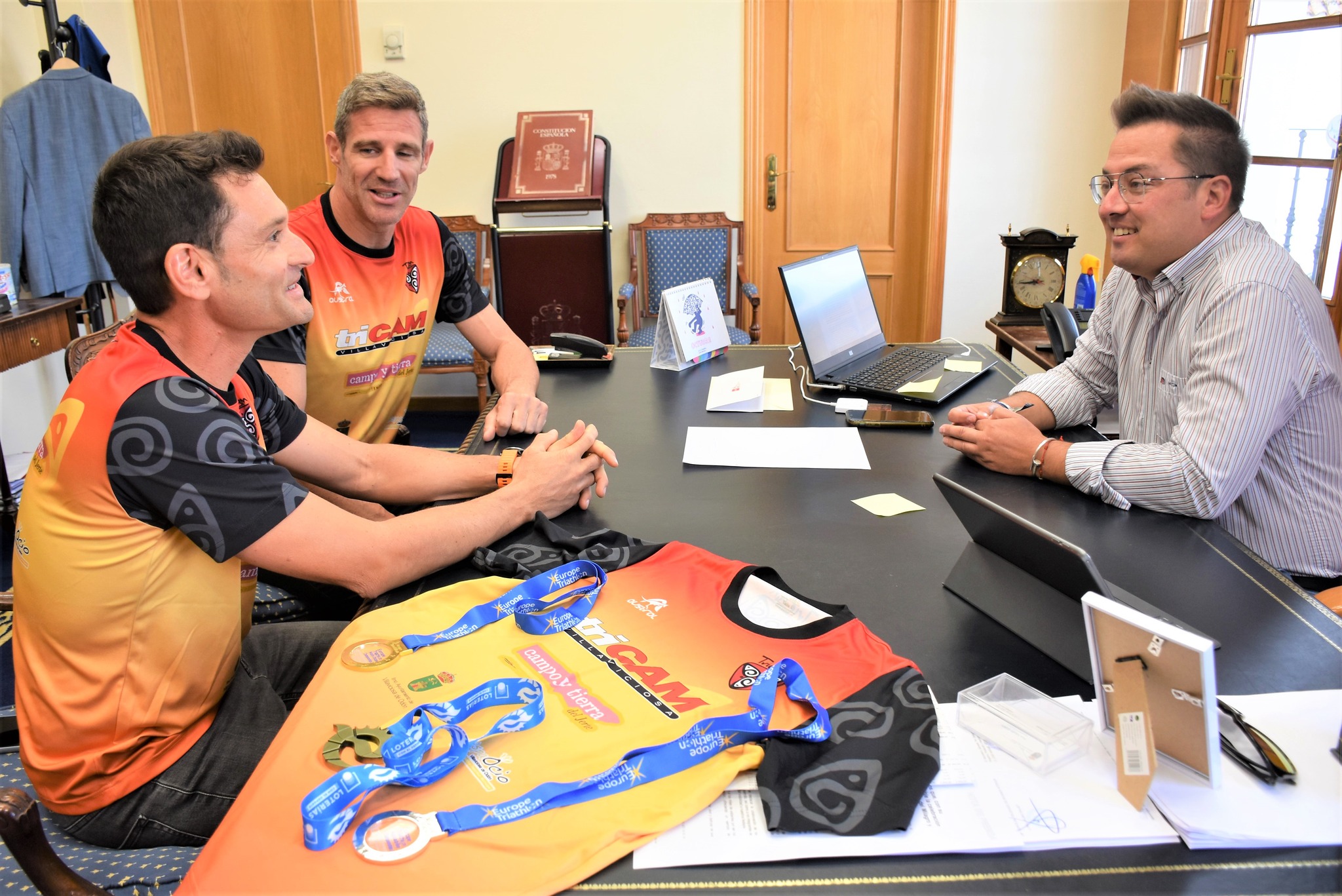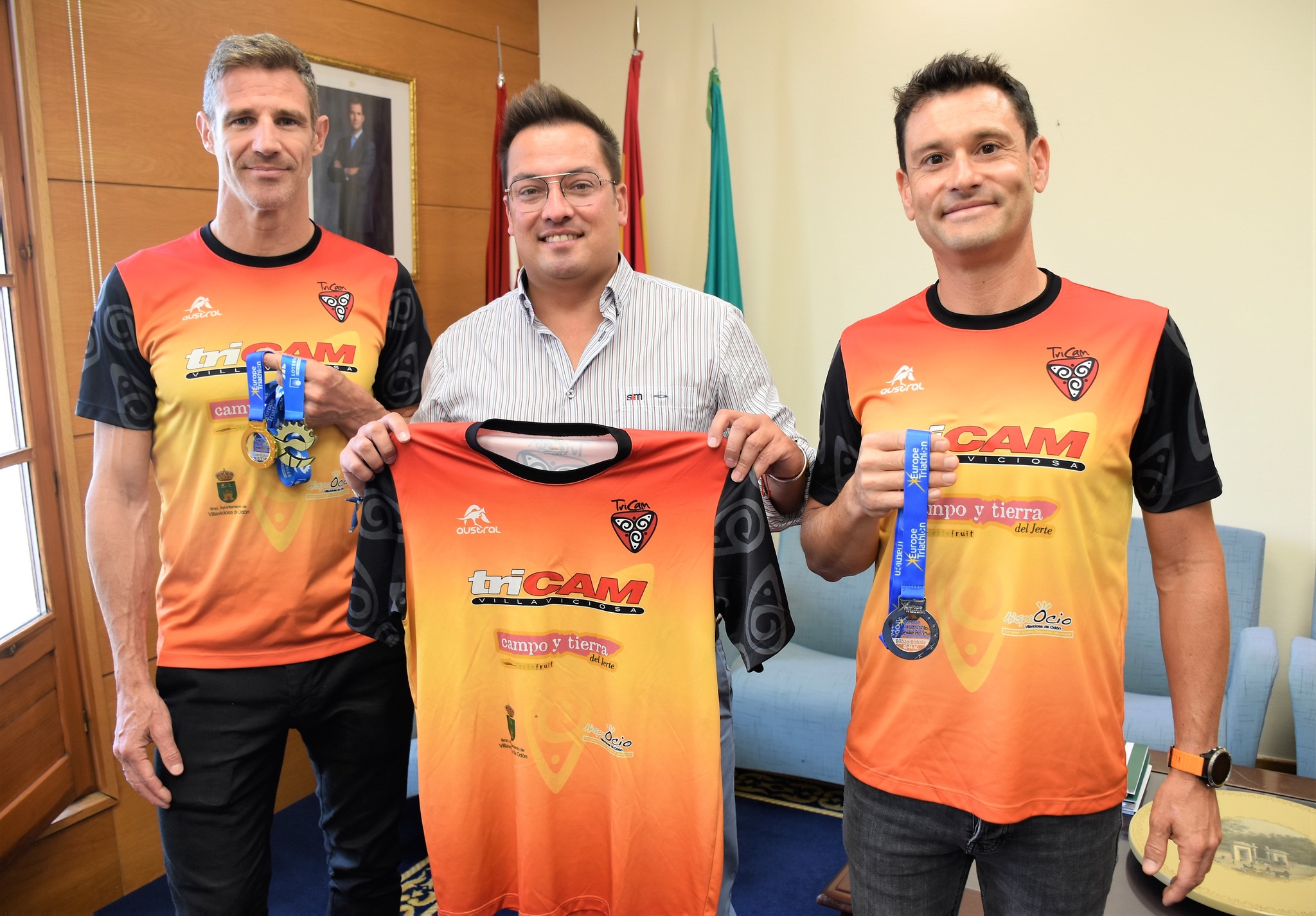 El alcalde recibe a dos integrantes del Club Tricam Villaviciosa por sus triunfos en sendas pruebas nacionales y europeas de Triatlón
