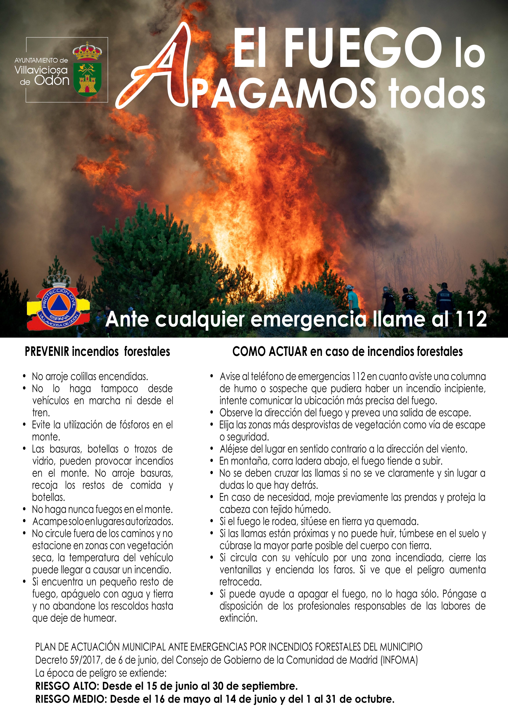 Por su parte, el Ayuntamiento está desarrollando el plan de desbroce para prevenir los incendios en la temporada estival. A tal efecto se recuerda que en enero de 2021 la Corporación municipal aprobó el Plan de Actuación Municipal ante Emergencias por Incendios Forestales de Villaviciosa de Odón (PAMIF). Este Plan tiene como objetivo hacer frente a las emergencias provocadas por una potencial situación de incendio forestal, proporcionando la máxima protección para las personas, los bienes y el medio ambiente en el ámbito territorial de nuestra localidad. Establece las medidas que se deben adoptar, los recursos humanos y materiales necesarios para hacer frente a la emergencia y el esquema de coordinación de las autoridades, organismos y servicios llamados a intervenir en caso de que se produzca dicho escenario.