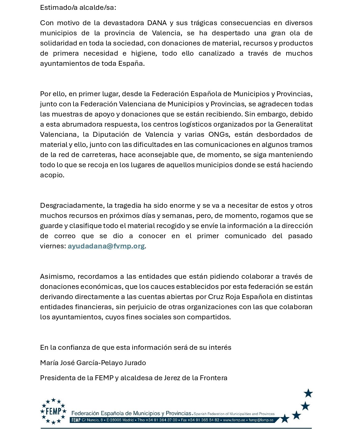La Federacion Española de Municipios y Provincias han enviado un correo a todas las localidades que están realizando la recogida de productos para los damnificados por la DANA. En la misma, como se puede leer en el documento adjunto, se informa lo siguiente: