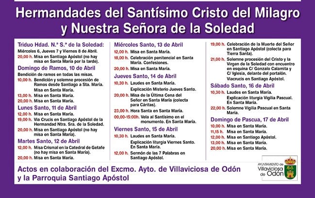 Actos programados para esta Semana Santa por parte de las hermandades del Santísimo Cristo del Milagro y de Nuestra Señora la Virgen de la Soledad en colaboración con la Parroquia de Santiago Apóstol y el Ayuntamiento de Villaviciosa de Odón.