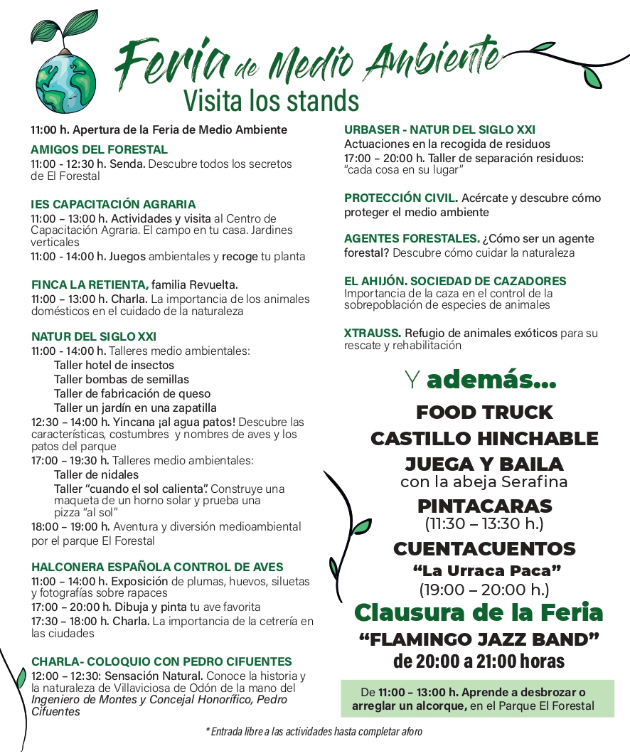 El próximo sábado Villaviciosa de Odón celebrará su primera Feria de Medio Ambiente. El Ayuntamiento de Villaviciosa de Odón, a través de la concejalía de Medio Ambiente, organiza esta iniciativa pensada para todos los públicos puesto que son muchas y variadas las actividades programadas. Desde talleres, sendas, exposiciones, pasando por divertidos pintacaras, cuentacuentos, food truck y hasta un castillo hinchable.