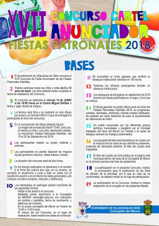 La concejalía del Menor convoca el concurso del Cartel Anunciador de las Fiestas Patronales Infantiles 2018. Este año se cumple la edición número diecisiete y como también suele ser habitual al mismo se pueden presentar todos los niños y niñas de 8 a 12 años de edad.