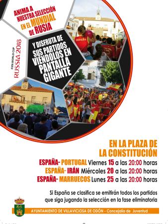 El Ayuntamiento de Villaviciosa de Odón, a través de la concejalía de Juventud, instalará una pantalla gigante en la Plaza de la Constitución donde se podrán ver todos los partidos que dispute España en el Mundial de Rusia. Es decir los de la fase de grupos y todos aquellos que siga dispuntando en el caso de que se clasifique para la fase final, es decir, los partidos de las rondas de octavos, cuartos y semifinales hasta la final o, en su caso, el tercer y cuarto puesto.
