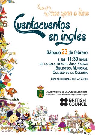 El sábado 23 de febrero, podréis disfrutar de una nueva edición del Cuentacuentos en Inglés, "Once Upon a Time", a las 11:30 horas en la Sala Infantil Juan Farias del Coliseo de la Cultura. Actividad organizada por el Ayuntamiento de Villaviciosa de Odón con la colaboración del British Council. Edad recomendada de 5 a 10 años.