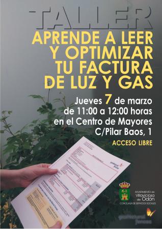 El jueves, 7 de marzo de 11:00 a 12:00 horas en el Centro de Mayores (calle, Pilar Baos, 1) se celebra un taller de acceso libre para "Aprender a leer y optimizar la factura de luz y el gas".