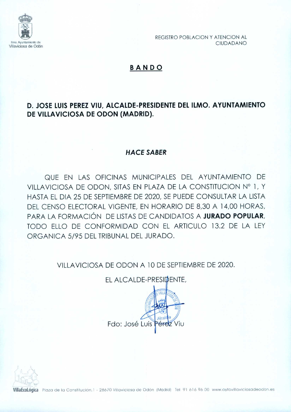 El alcalde, José Luis Pérez Viu, ha dictado un bando en el que informa de la puesta a disposición de los ciudadanos de la lista de Censo Electoral para que pueda ser consultada con motivo de la celebración del sorteo para conformar los candidatos a Jurado Popular. Se encuentra expuesta en las dependencias municipales de la Plaza de la Constitución, 1, de 8:30 a 14:00 horas, de lunes a viernes hasta el 25 de septiembre.