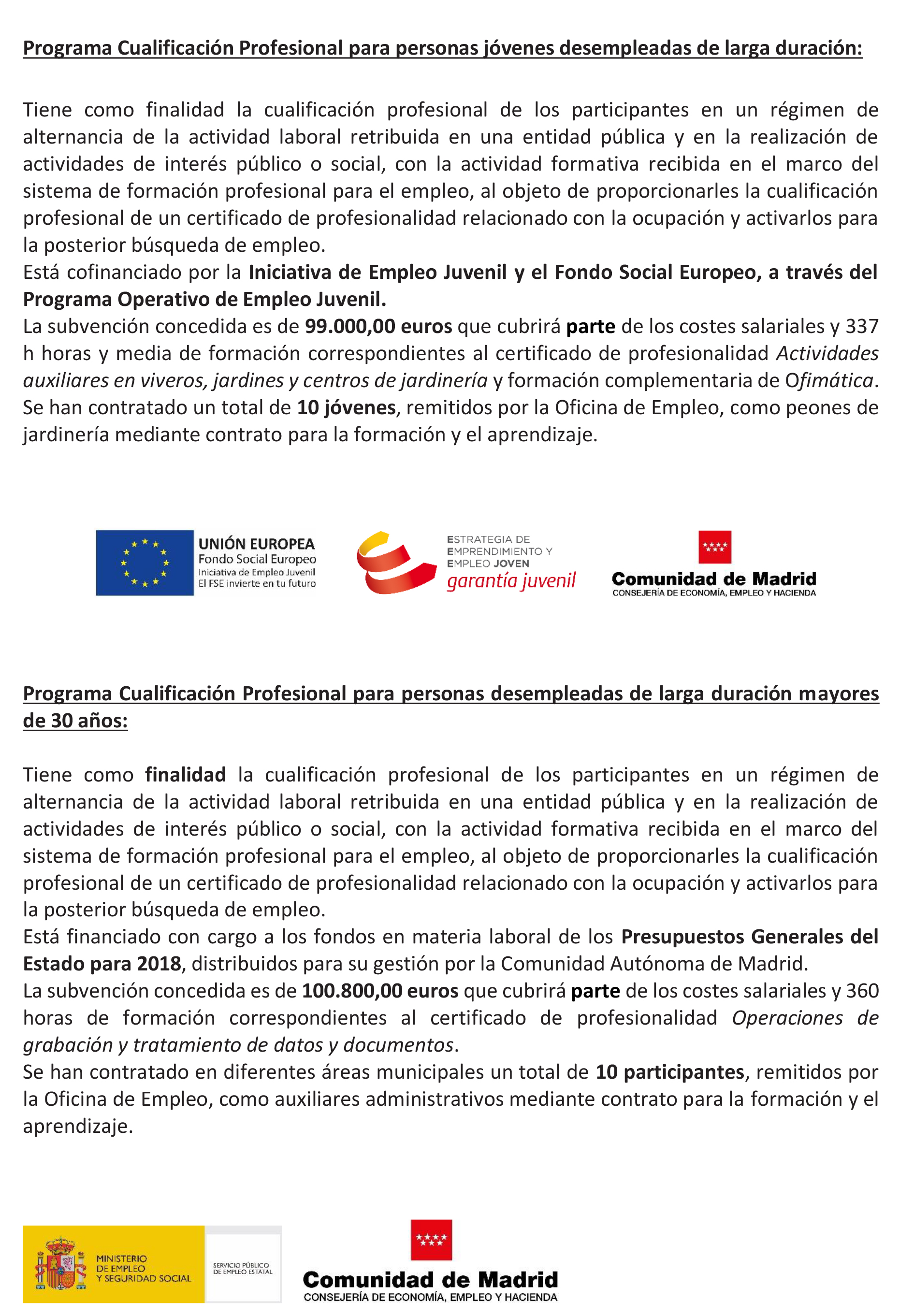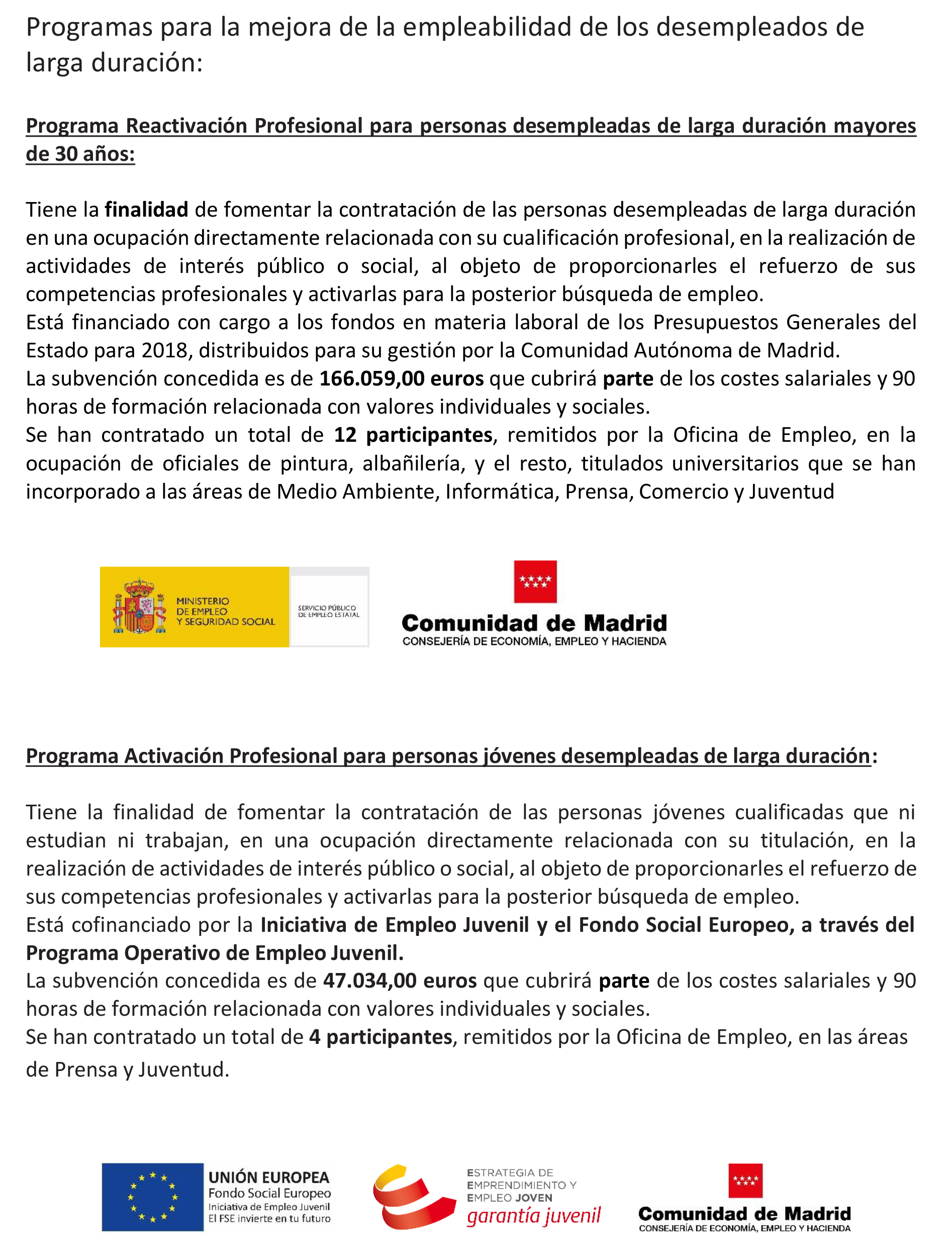 El Ayuntamiento de Villaviciosa de Odón ha recibido subvenciones de la Comunidad de Madrid para la contratación de 36 personas desempleadas de larga duración. Se trata de cuatro programas diferentes de formación en alternancia con la actividad laboral dirigida a la mejora de la empleabilidad de los desempleados de larga duración.