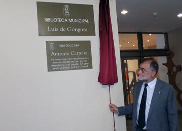 Antonio Carreira agradeció este reconocimiento si bien matizó que lo que más le ilusionaba era “que se haya dado el nombre de Góngora a la biblioteca aunque este autor no tuviera relación directa con el pueblo. Es una muestra más de que la figura de Góngora se ha ido valorando cada vez en mayor medida hasta llegar a ser reconocido como nuestro mejor poeta”.También se mostró orgulloso de que su nombre figurase “junto al de mi amigo Juan Farias”, cuyo nombre preside la sala de lectura infantil.Carreira fue catedrático de Lengua y Literatura en el instituto de Educación Secundaria Calatalifa de Villaviciosa de 1990 a 2003. Además tiene más de 150 publicaciones entre libros, ediciones, artículos y reseñas sobre Literatura española del Siglo de Oro y del XX.