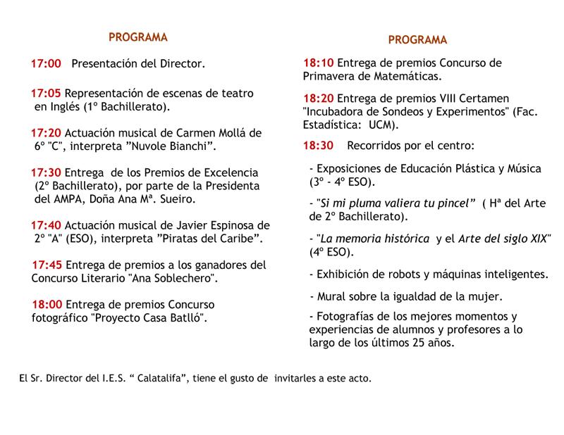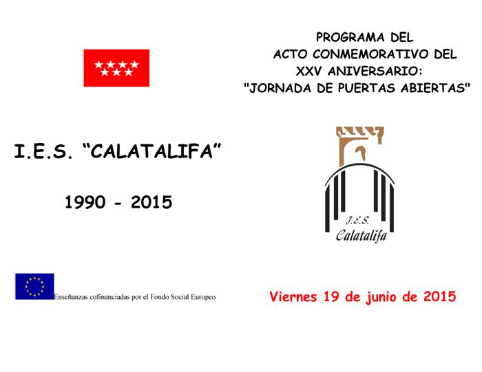 El IES Calatalifa celebra este viernes, 19 de junio, un acto para conmemorar su XXV aniversario Por esta razón se han programado un gran número de actividades para este día de jornadas de puertas abiertas. Sin duda, uno de los momentos más destacados de este programa será la entrega de los Premios de Excelencia de segundo de bachillerato por parte de su presidenta, Ana María Sueiro. Este galardón, en el que colabora el Ayuntamiento de Villaviciosa de Odón, lo reciben los alumnos y alumnas que hayan obtenido las cuatro mejores notas medias de Bachillerato .