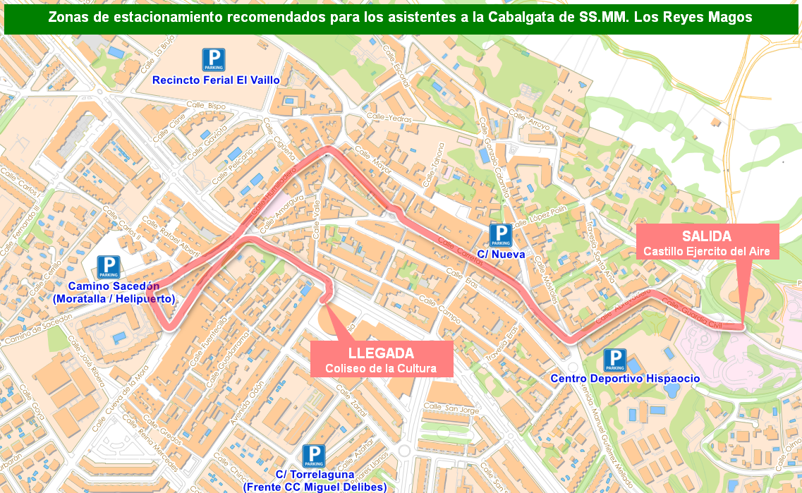 Debido a que el recorrido de la Cabalgata afectará al estacionamiento se recomienda las siguientes zonas para aparcar los vehículos. Todas ellas son de acceso libre.