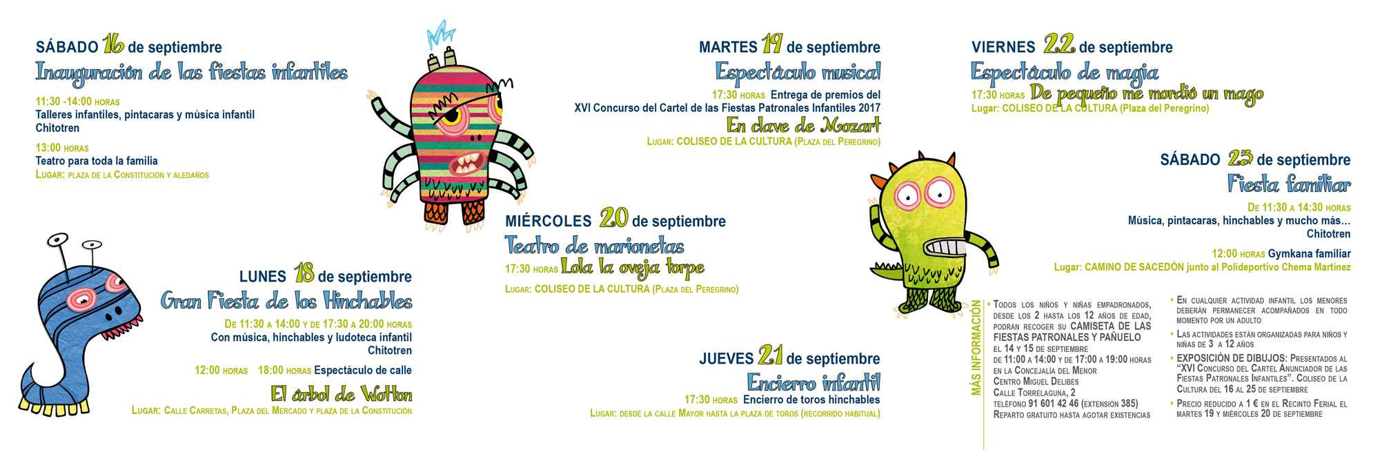 El jueves 14 y el viernes 15 de septiembre los niños y niñas empadronados desde los 2 a los 12 años podrán recoger su camiseta de las fiestas patronales y el pañuelo de 11:00 a 14:00 y de 17:00 a 19:00 horas.