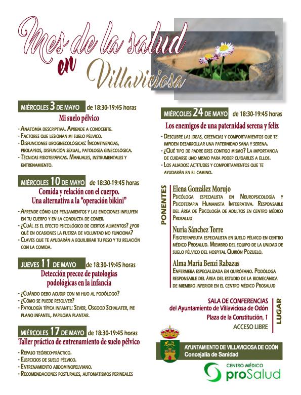 Villaviciosa de Odón dedica el mes de mayo a la Salud, razón por la que desde la concejalía de Sanidad y Consumo, en colaboración con el Centro Médico Prosalud, han programado cinco charlas de carácter gratuito. El lugar elegido donde se impartirán cada una de ellas será la sala de conferencias situada en el Ayuntamiento de Villaviciosa de Odón, Plaza de la Constitución, 1. El concejal del área, Agustín Reguera, invita a participar en esta interesante iniciativa tanto por los temas que se abordarán como por la experiencia profesional de cada una de las ponentes.