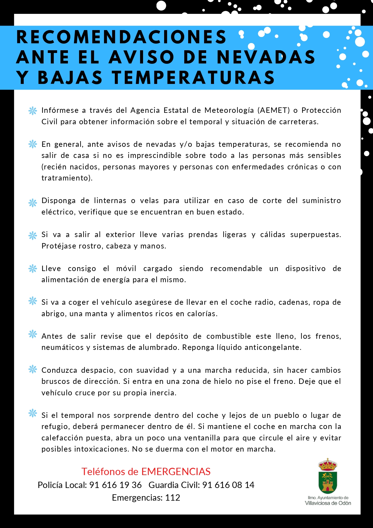 Aante las previsiones climatológicas realizadas por la Agencia Estatal de Meteorología (AEMET) de aviso rojo por nevadas y heladas, el Ayuntamiento de Villaviciosa de Odón pide extremar las precauciones y evitar los desplazamientos innecesarios.